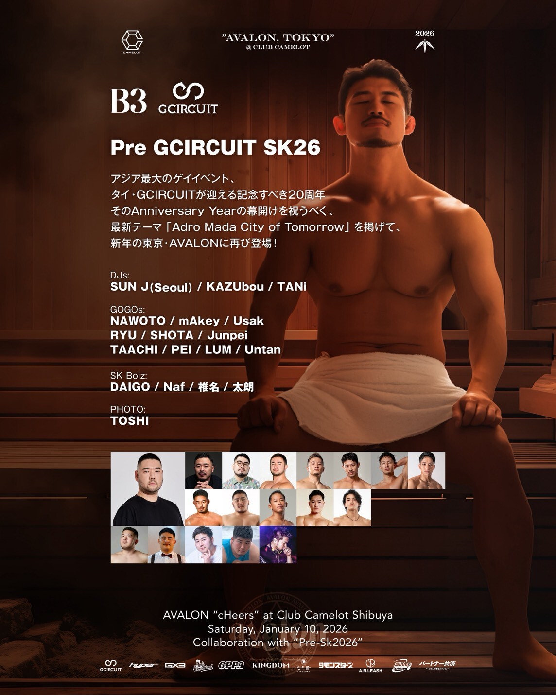 Kick off 2026 with AVALON, TOKYO – a high-energy men’s party night in the heart of Shibuya. This edition, “CHEERS,” is a special collaboration with “Pre-SK2026 / Pre GCIRCUIT SK26” and the futuristic theme “Adro Mada: City of Tomorrow.”